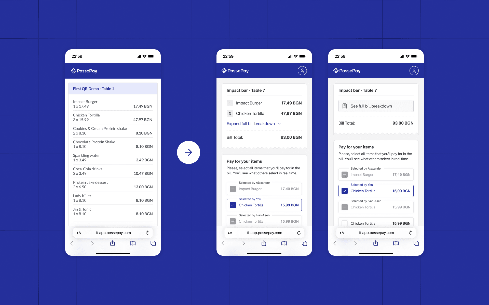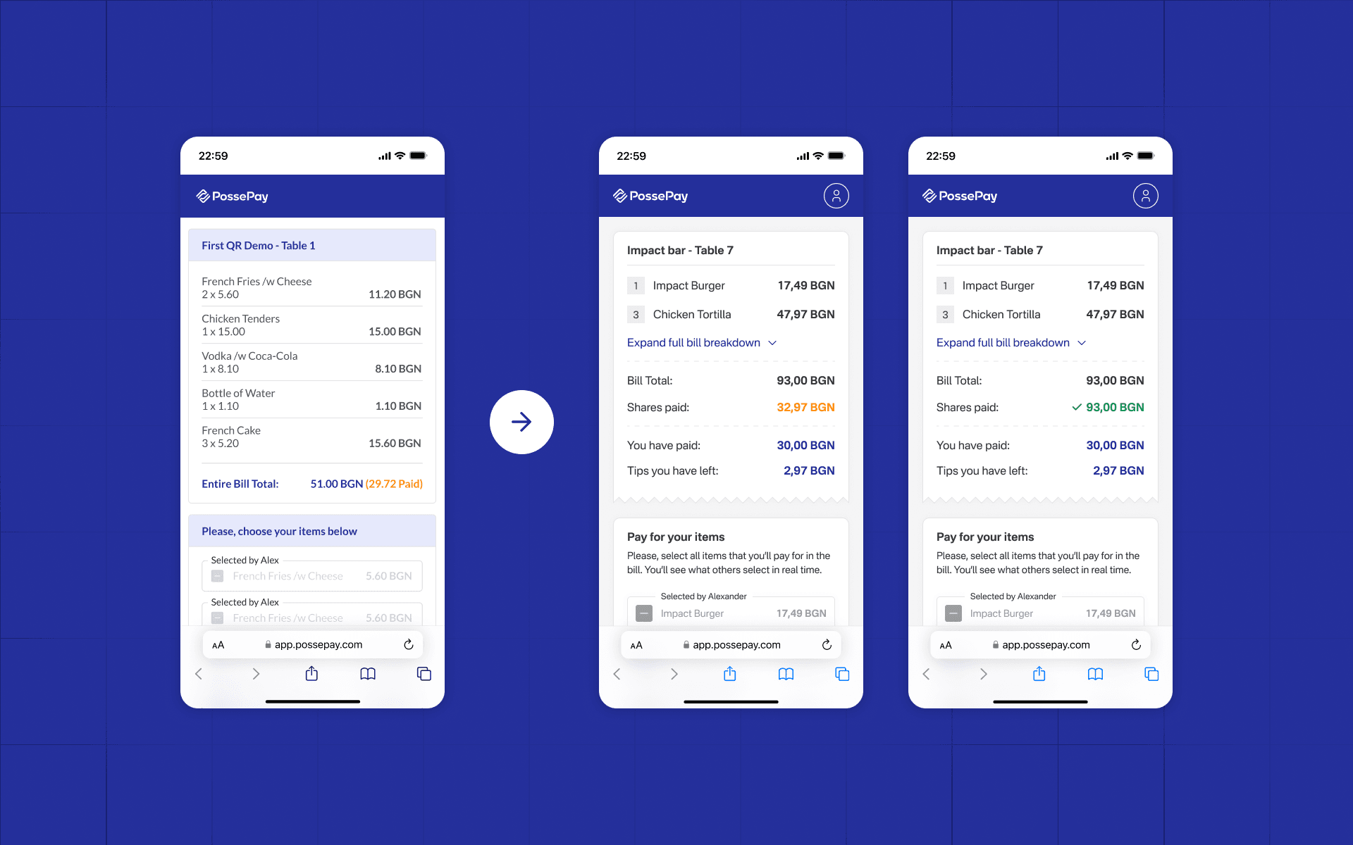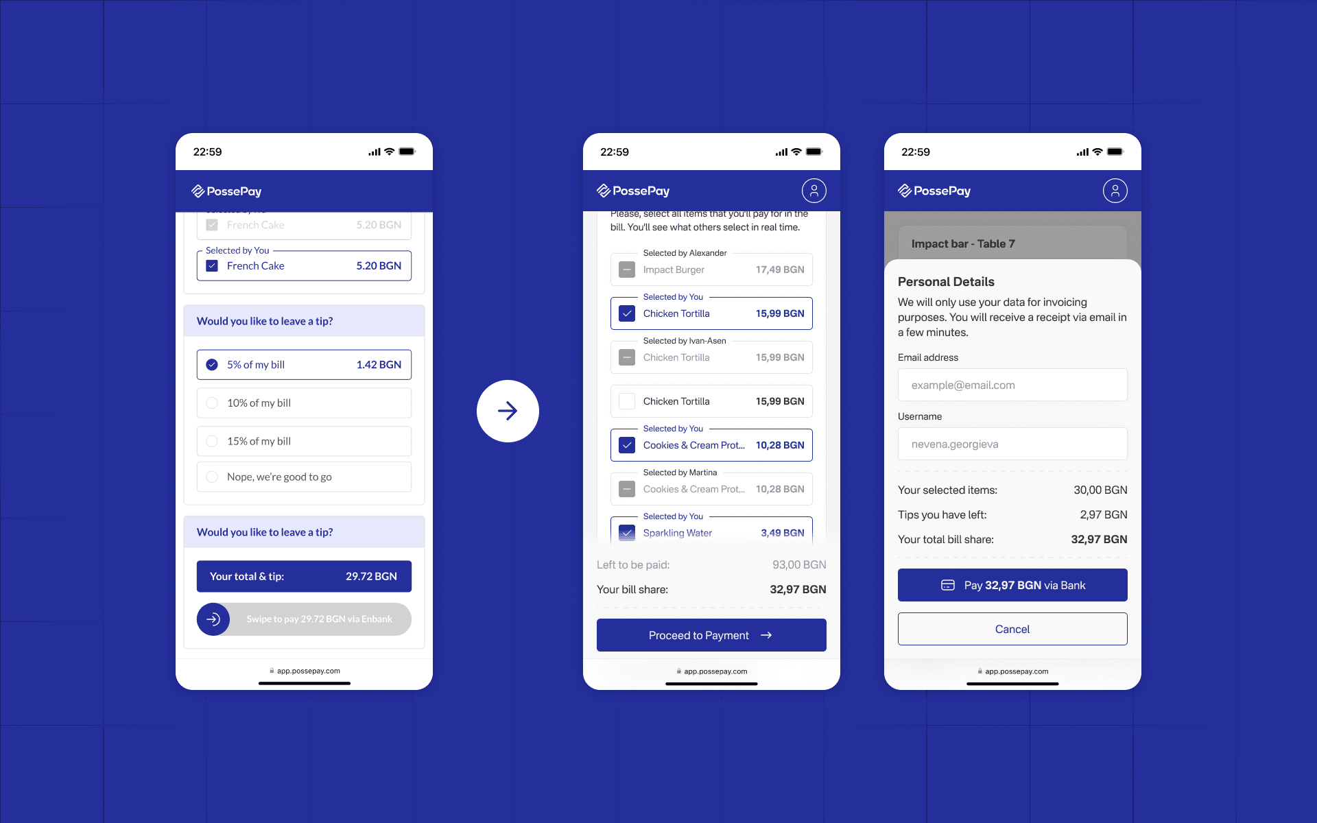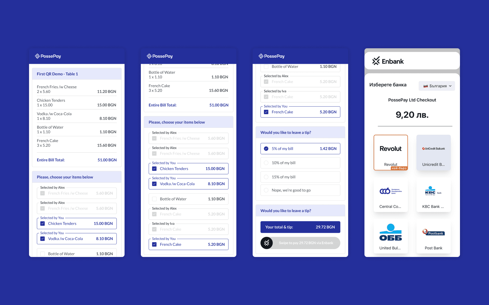 The group tip math where "some extra money" never seems to be enough. We've all been there. PossePay was a Bulgarian fintech startup letting people scan, split, and pay their restaurant bill individually - no app, no friction. I joined as co-founder and sole product designer.