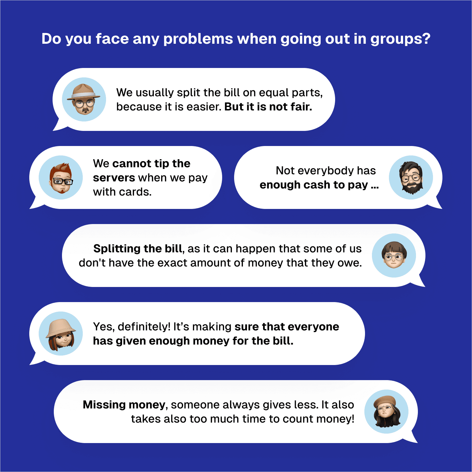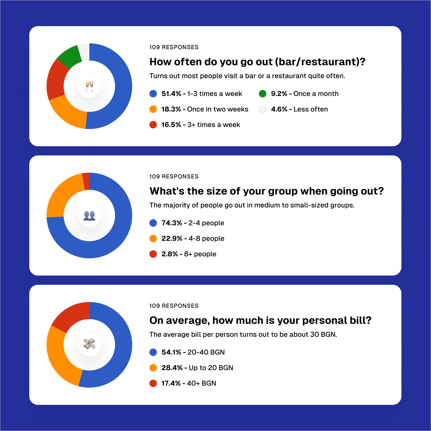 Before designing anything, we needed to know whether the bill saga was a genuine pain point or just something people complained about and then forgot. So we asked. We surveyed over 100 people about their most recent dining experience, looking for behavioral patterns and recurring frustrations. The data confirmed what we suspected - splitting the bill and tipping by card were consistently painful, and existing workarounds felt clunky.